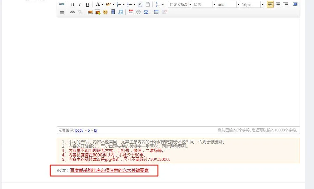 爱采购产品通过百度开发的万花筒后台增加产品,但不限产品数量,也没有重复品惩罚策略,而且有一个非常有意思的地方,如果你仔细看,会发现编辑框下边有这么个优化建议: