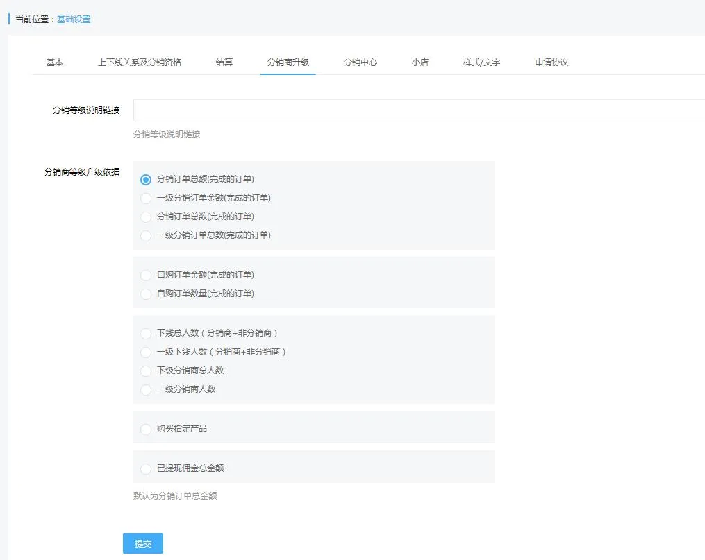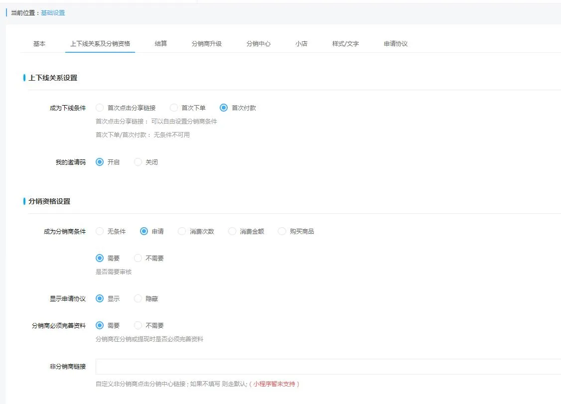 然后,设置成为上下级关系的条件,以及分销商资格的设定。
