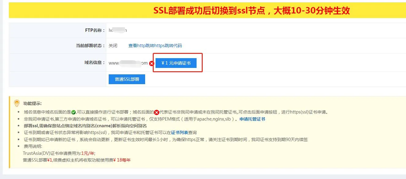 接下来就会弹出部署SSL需要的一些功能说明以及费用说明,西部数码部署SSL是需要收费的,但这个费用很低,大概不到20元,但好处是SSL很稳定,像宝塔面板等部署的免费的ssl一般都是三个月自动签约证书,非常容易掉,为了网站的稳定还是建议花小钱解决大麻烦吧。