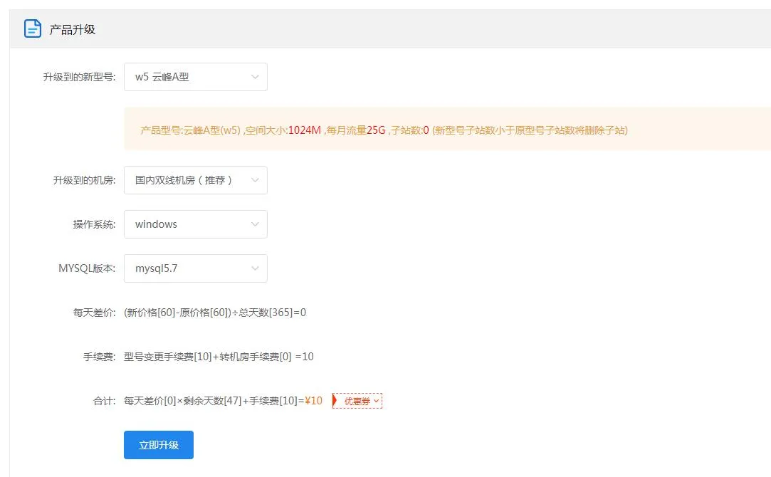 西部数码的空间升级还是比较方便的,他会按照目前使用时间进行计费估算,然后多退少补的原则进行空间上的一键升级,还是很方便的: