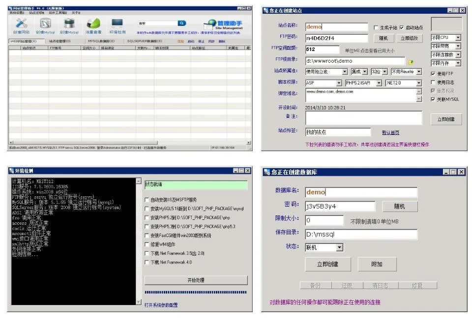 1.一键添加IIS站点、FTP帐号、建网站目录、开Mysql数据库,可选支持asp,php,asp.net等脚本,各站点独立权限。