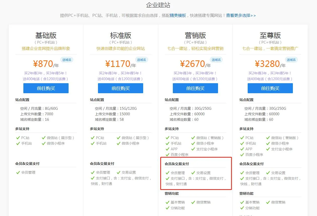 我们可以看到,西部数码的云建站中,营销型站点售价不到3000元/年,其中包含了商城的基础功能“会员管理”,“订单管理”还有简单的营销功能“团购”和“优惠券”等等,功能小而全,适合企业网站前期的线上功能需求了。