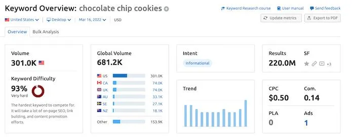 单击“立即开始”按钮,Semrush 将显示有关您刚刚输入的关键字的大量信息。