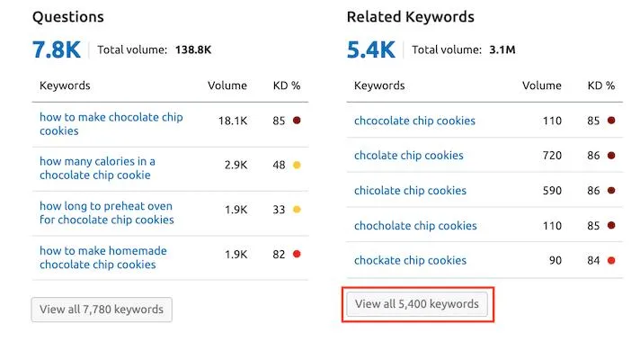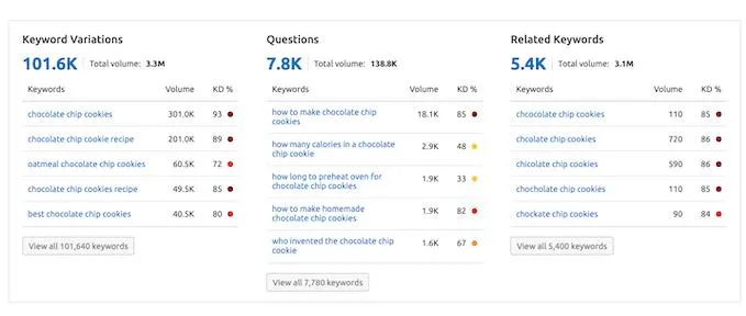 然后,您可以查看这些相关单词和短语的搜索量和趋势。这可以帮助您找到可能为您的网站带来大量高转化、高度集中的流量的新关键字。
