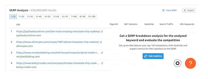 SERP 分析部分显示您最初输入的关键字的热门搜索结果列表。