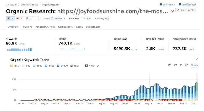 有很多值得探索的地方。您可以通过点击“自然关键字”查看最有用的报告之一。这将显示域名的关键字列表以及搜索量、搜索排名、URL 等。