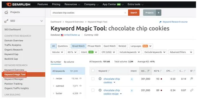 如果您想了解更多有关相关关键字的信息,那么 Semrush 有一个关键字魔术工具。这使您可以快速访问有关更广泛的相关关键字的信息。