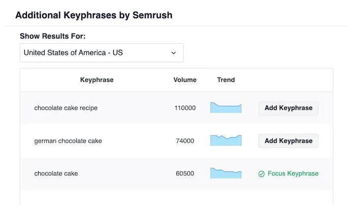 AIOSEO 甚至会显示每个相关关键词的搜索量和趋势。这可以帮助您确定可以为您的网站带来最多访问者的条款。