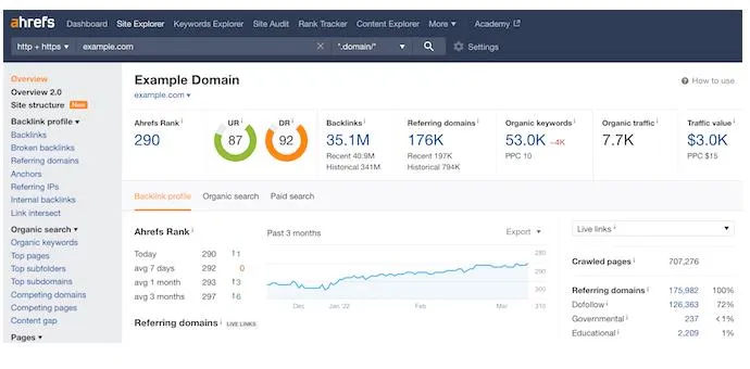 Ahrefs 有一个用户友好的界面,可以将这些数据分成不同的部分。只需在搜索字段中输入域,Ahrefs 就会以易于理解的格式显示大量信息。