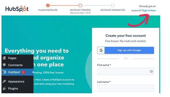 激活后,该插件将向您的 WordPress 管理侧边栏添加一个新的 HubSpot 菜单。单击它将带您进入设置向导,您需要单击顶部的“在此处登录”链接。