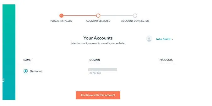 这将弹出一个弹出窗口,您需要在其中输入您的 HubSpot 登录详细信息。之后,您可以选择您的网站,然后单击“继续使用此帐户”按钮。