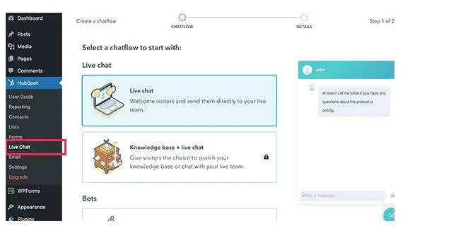 同样,您也可以通过访问HubSpot » 实时聊天页面并单击“创建聊天流”按钮来创建实时聊天小部件。