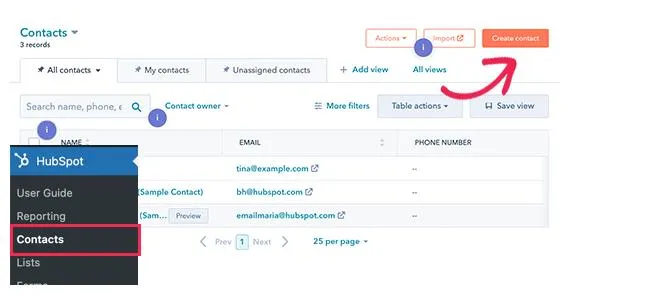 您还可以通过访问HubSpot » 联系人页面并单击“创建联系人”按钮来手动添加联系人。