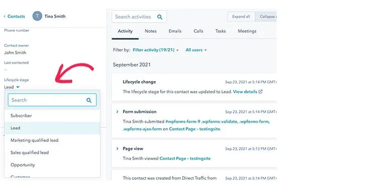 从 WordPress 仪表板的 Hubspot 菜单中,您只需单击联系人姓名即可对其进行编辑,并查看所有交互的详细视图。您可以查看引导他们提交表单的用户旅程。