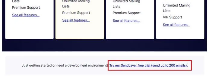 不过,如果您还不想购买 SendLayer,那么可以点击底部的 “试用 SendLayer 免费版(最多可发送 200 封邮件)”链接。