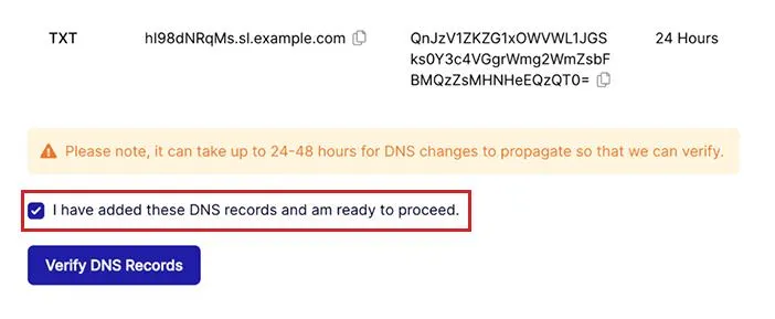 在主机控制面板中添加所有 DNS 记录后,只需勾选 SendLayer 页面底部的 “我已添加这些 DNS 记录并准备好继续 “框即可。
