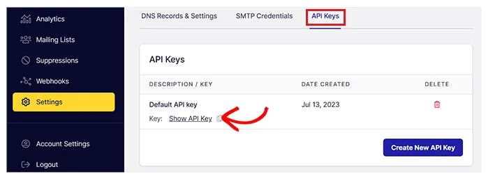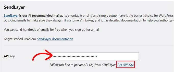 在这里,你必须粘贴之前从 SendLayer 面板上复制的 API 密钥。如果你之前无法复制密钥,那么你只需点击 “获取 API 密钥 “链接,即可返回到你的 SendLayer 账户。