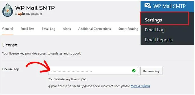 到达后,在 “许可证密钥 “选项旁边添加插件的许可证密钥。您可以在 WP Mail SMTP 网站上的账户页面找到此信息。